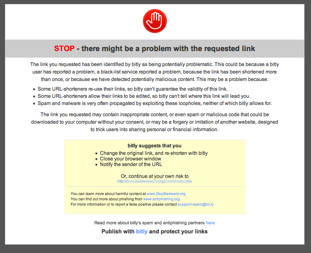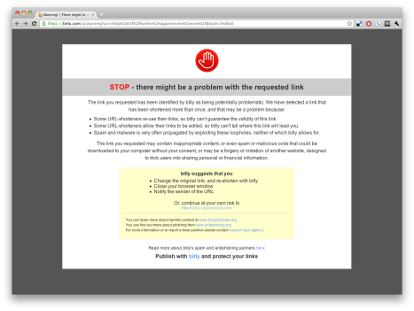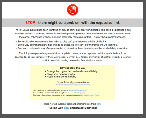 I was interested last week to discover that, unknown to me, the link shortening service bit.ly was displaying a warning message when anyone clicked on one link I had shortened with them. The link was to a controversial but entirely valid political commentary and there had been no indication that this would happen when I shortened the link. I was even more concerned that the warning message implied I was attempting to hide spam or malware in the link. The message displayed looked like this: